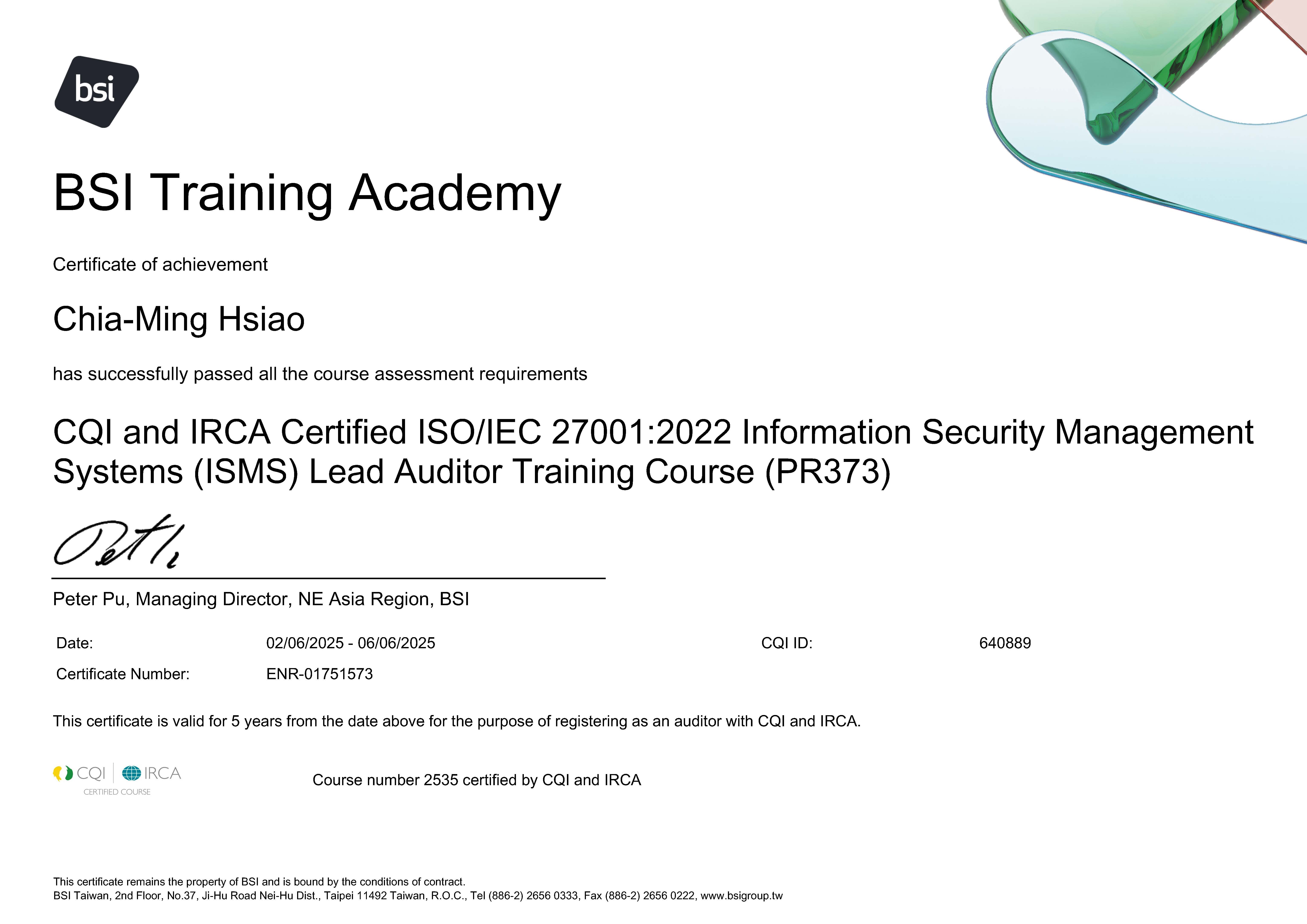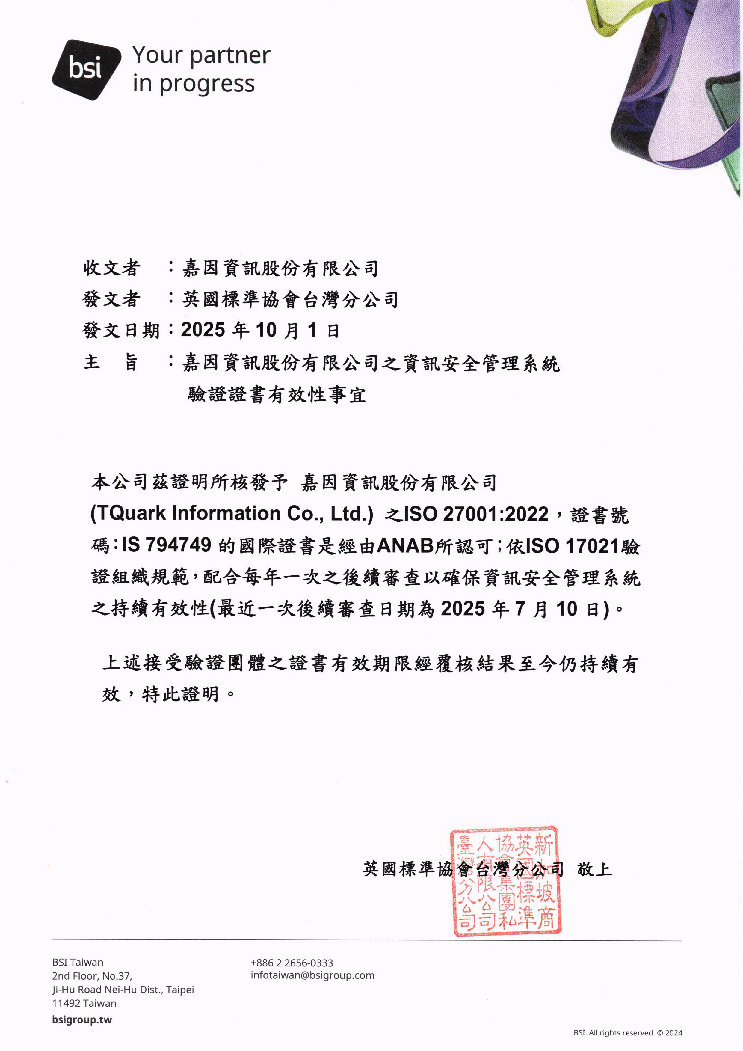 經 BSI 驗證獲得 ISO 27001:2022 資訊安全管理系統驗證,證書編號 IS 794749。